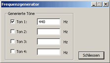 Öffnen des Frequenzgenerators Zum Öffnen des Frequenzgenerators wählen sie "Frequenzgenerator" vom Menü "Stimmen" in der Menüleiste. Frequenzparameter Sie können vier verschiedene Frequenzen eingeben die gleichzeitig gespielt werden. Klicken sie in die Checkbox um die entsprechenden Töne ein- bzw. auszuschalten. Schliessen Schliesst den Frequenzgenerator.